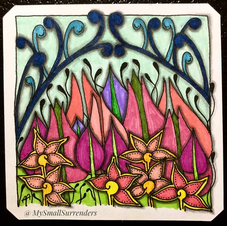 Since learning how to draw it a few years ago, Mooka is a pattern that I use often when I draw in my art journal/sketchbook because I like the curved lines. Before this challenge, I had no prior experience with either of the other two patterns: Javik or Tulip. Still, I was glad to add these floral-based patterns to my pattern list.