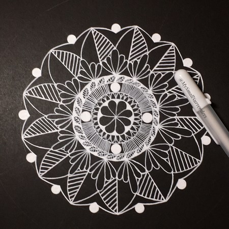 When I started it, I drew five rings for this mandala. Then, as I filled it in, I added two more rings. If you look closely, you can see the faint graphite line from my pencil.