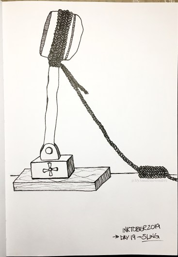 The prompt for Day 19 of InkTober, Sling, made me think of the battle scenes from the series where medieval weapons were used to hurl a variety of deadly projectile objects at enemies across battlefields. They used the massive wooden slings (trebuchets) to launch boulders and buckets of fiery hot oil long distances.